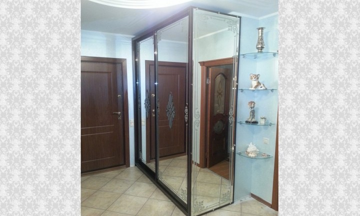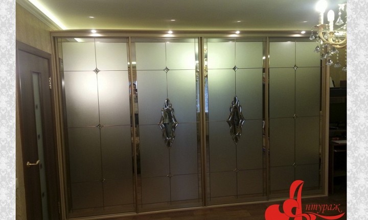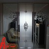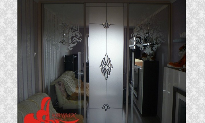 Фацетный витраж. Вашему дому не хватает изысканности и блеска - выбирайте фасады с фацетным витражом. Для изготовления выпускаются специальные фацетные элементы "Бевелсы" - стеклянные фигуры со скошенной гранью. Фигуры могут быть различной формы, одна большая композиция может быть составлена из нескольких бевелсов, они могут обрамляться специальной лентой различных оттенков. Фацетные элементы могут быть прозрачными, цветными, с разноцветной мерцающей пленкой Dichroic и с эффектом морозного инея. Фацетный витраж может комбиноваться с различными непрозрачными пленками и прекрасно сочетается с пескоструйным рисунком. Прикрепляютя фацетные элементы к основанию профессиональным клеем, упрочненным ультрафиолетовыми лучами специальной лампы. Этот метод признан самым распространенным и успешным, т.к. прочность соединения превышает прочность стекла. Шкаф-купе с фацетным витражом лучше смотрится при хорошем освещении. Поэтому, если Вы не предусмотрели дополнительное освещение шкафа в потолке, Вы можете подобрать споты или светильники для шкафа в салоне.